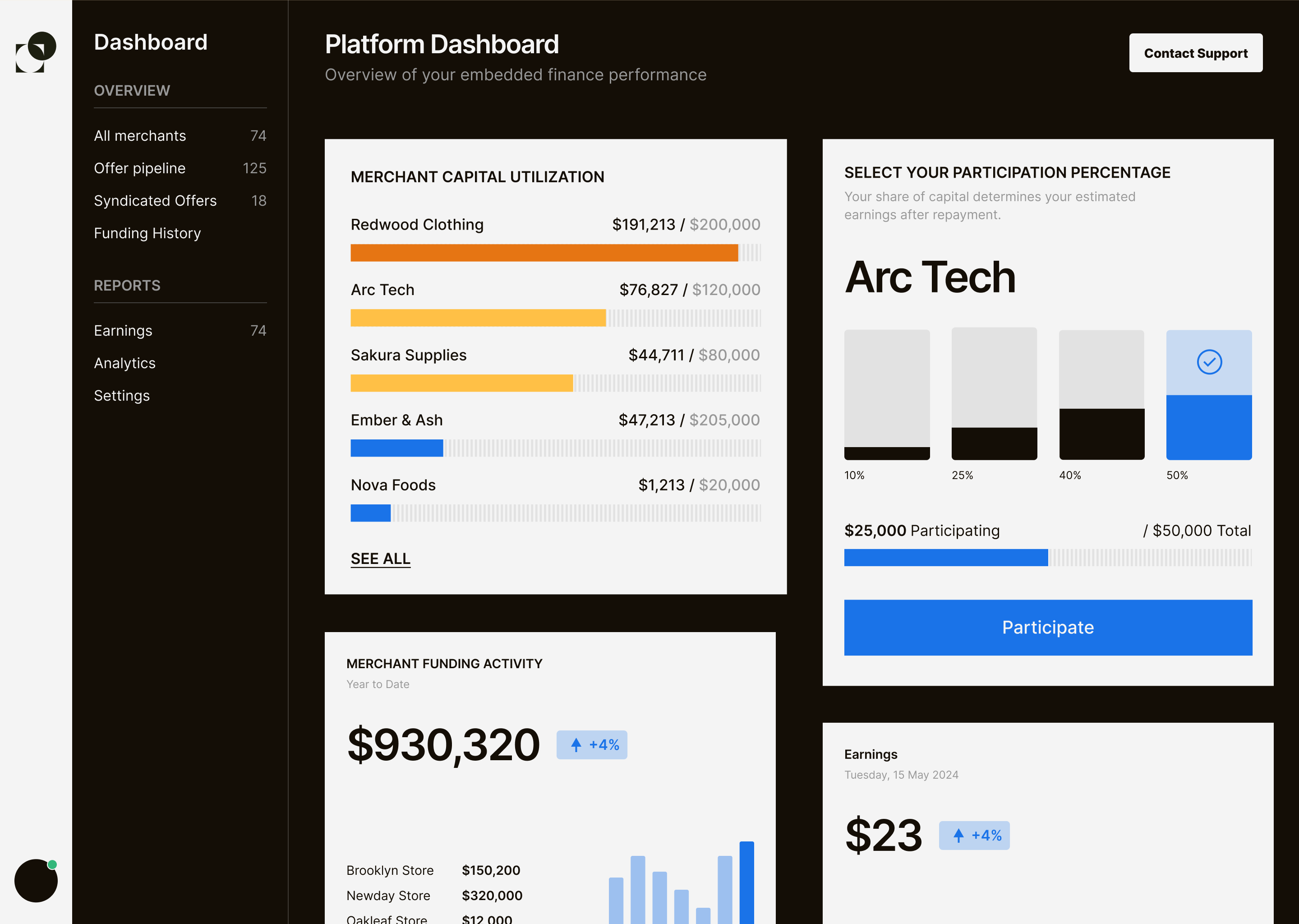 Monitor funded deals, merchant activity, and financial impact in real time.